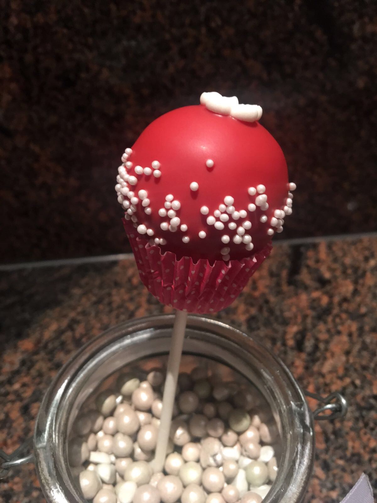 Kugel rot mit Perlenumrandung und weisse Blume