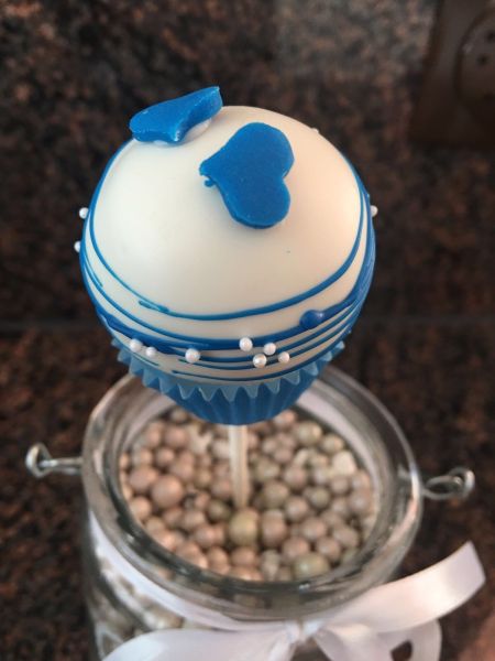 Kugel weiss mit zwei blauen Herzen und blauer Umrandung und Perlen weiss